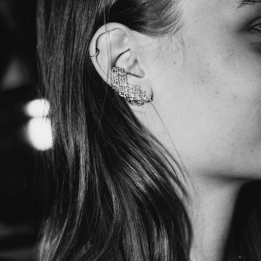 It glides up fingers, swings in ears and needs space on the neck and hand. It is on the large side but at the same time possesses strength and lightness, not unlike armour from the past, which also had the role of protection.