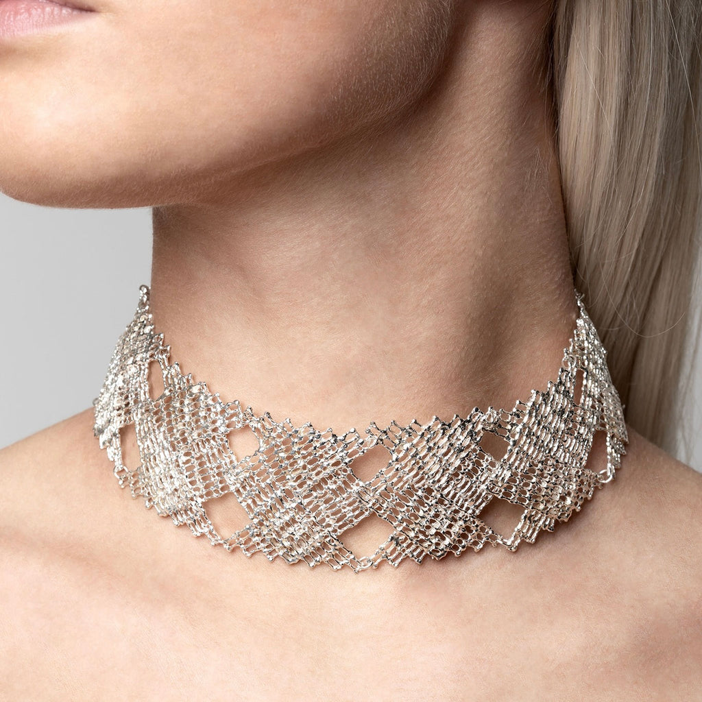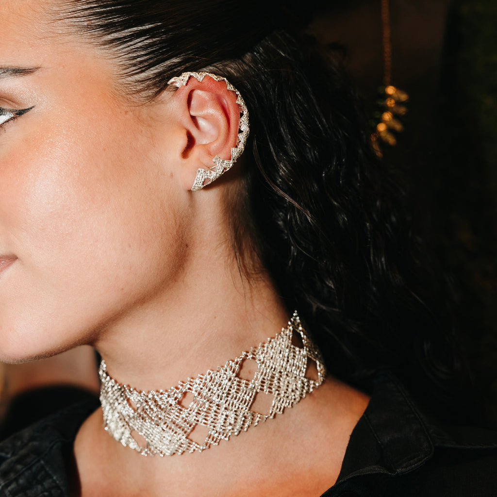 It glides up fingers, swings in ears and needs space on the neck and hand. It is on the large side but at the same time possesses strength and lightness, not unlike armour from the past, which also had the role of protection.