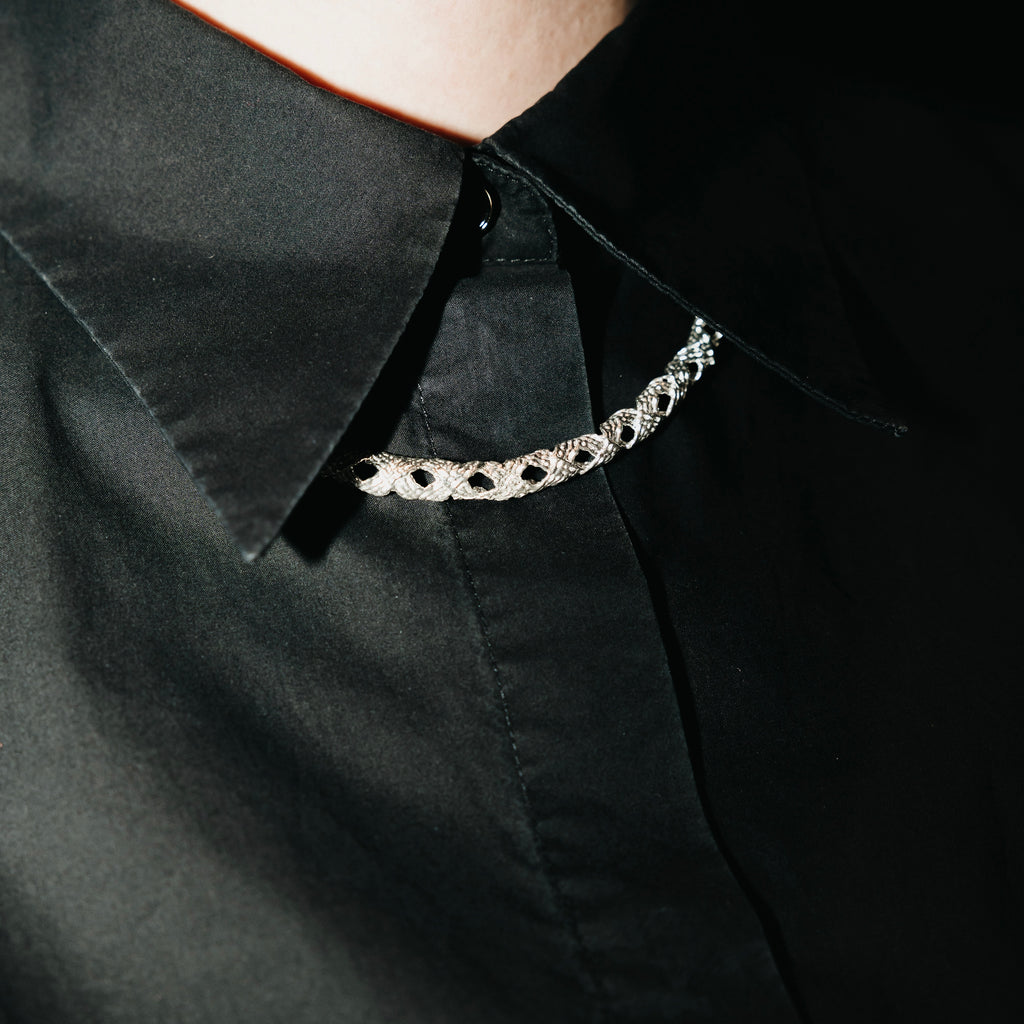 It glides up fingers, swings in ears and needs space on the neck and hand. It is on the large side but at the same time possesses strength and lightness, not unlike armour from the past, which also had the role of protection.