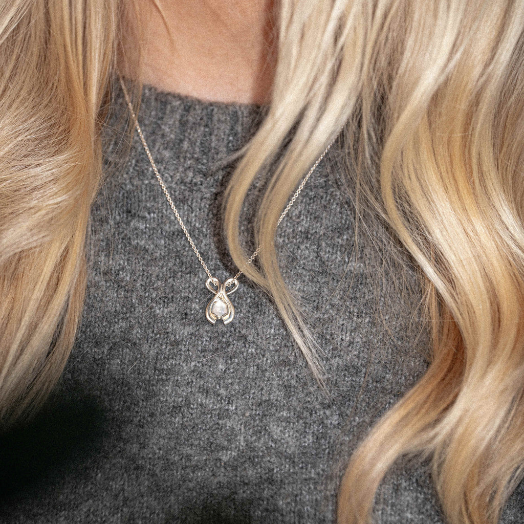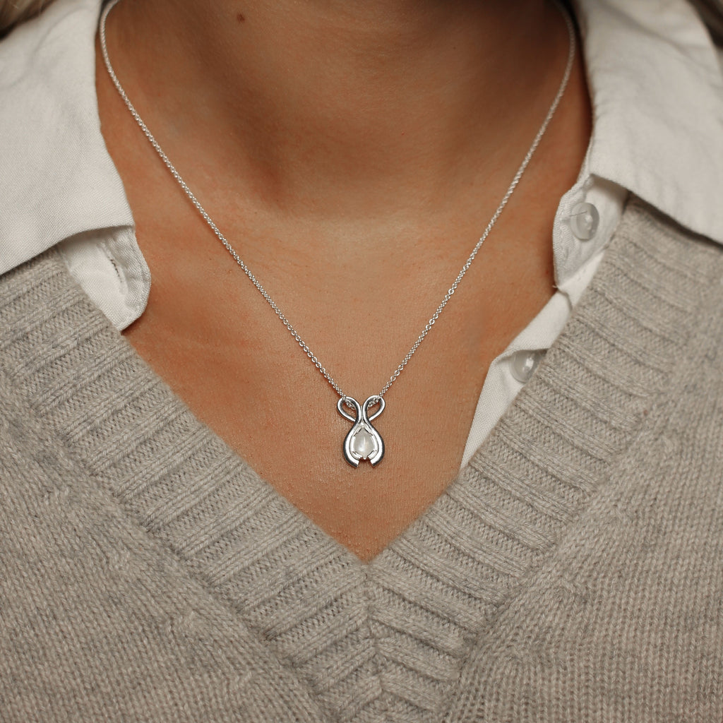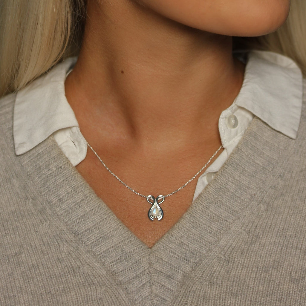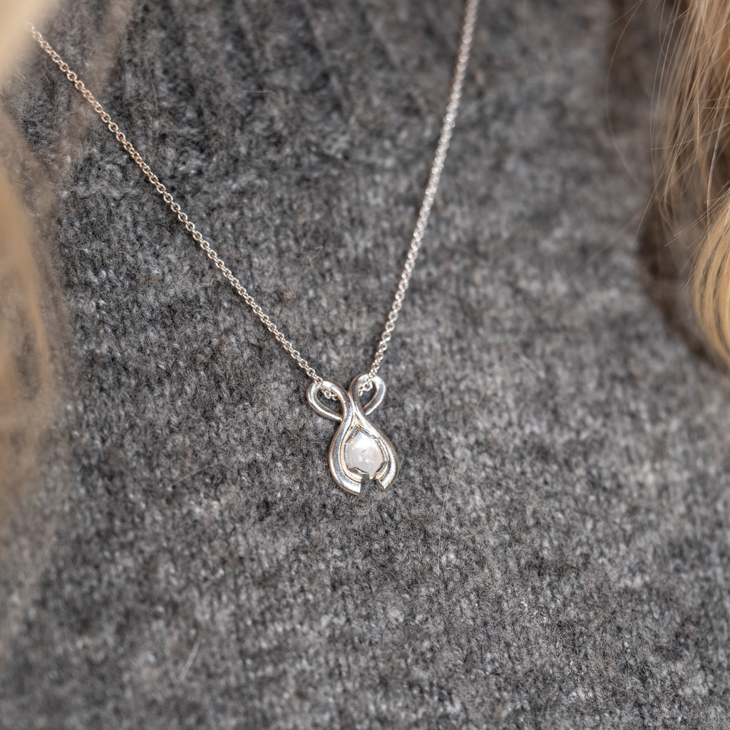 This necklace is inspired by the selfless work of the Hringskvenna women, designed to reflect the love and care they provide through their efforts. The pendant features a heart shape with two arms embracing a Rainbow Moonstone. The heart symbolizes love, kindness, and compassion, while the stone represents the children.