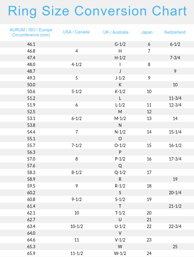Our standard ring sizes range from 46-66, which refers to the inner circumference of the ring in millimetres. This is the ISO standard and is used in much of Europe. If you're from another country and need some guidance about your ISO size, here is a handy chart: