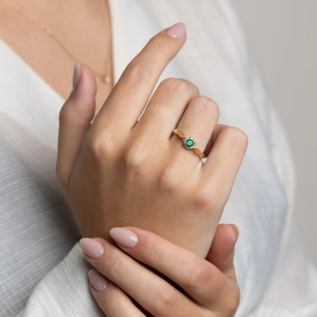 Material: 14K gold. 1 lab grown emerald (4 mm). Total of 12 lab grown diamonds: 0.06 ct. (VS F+)