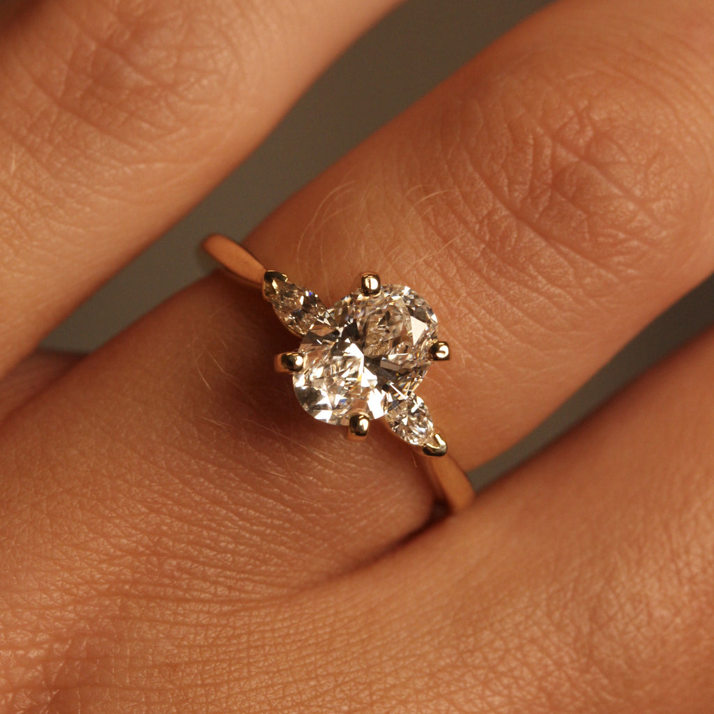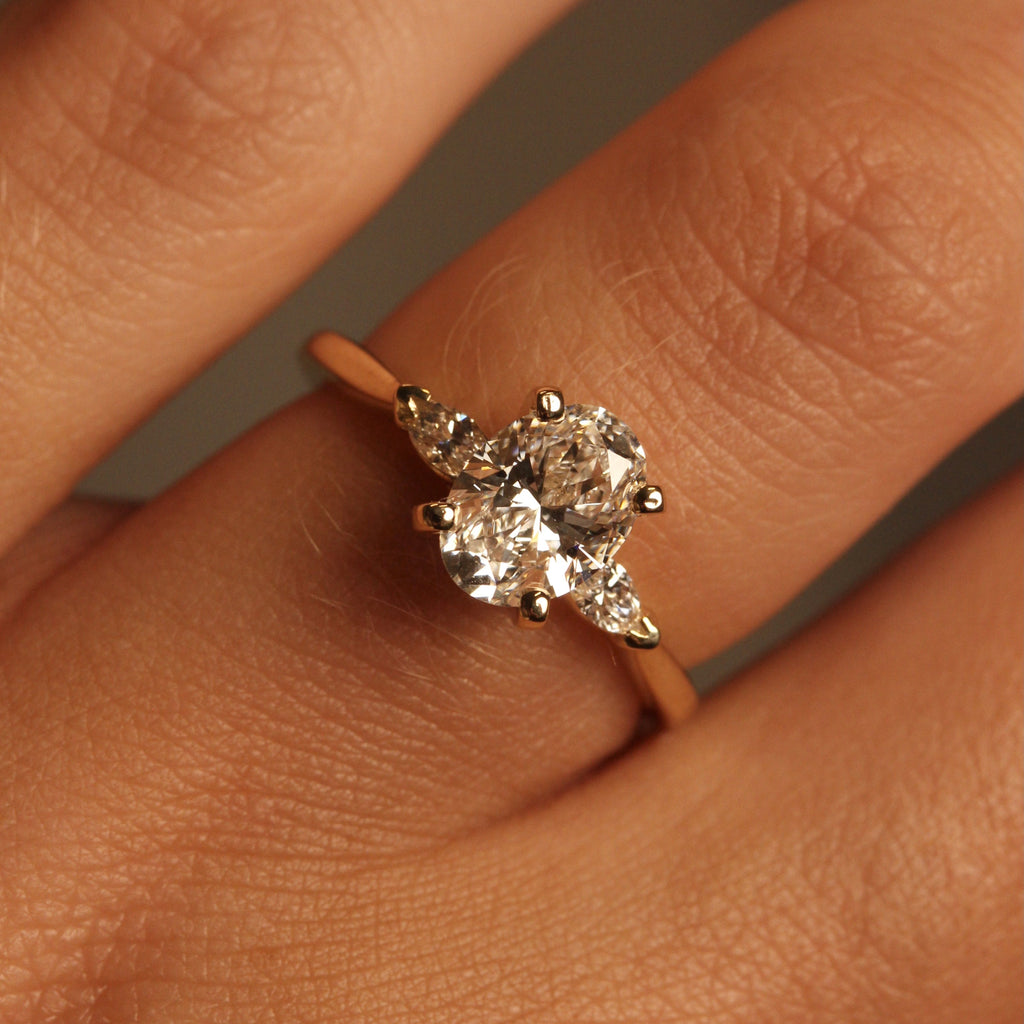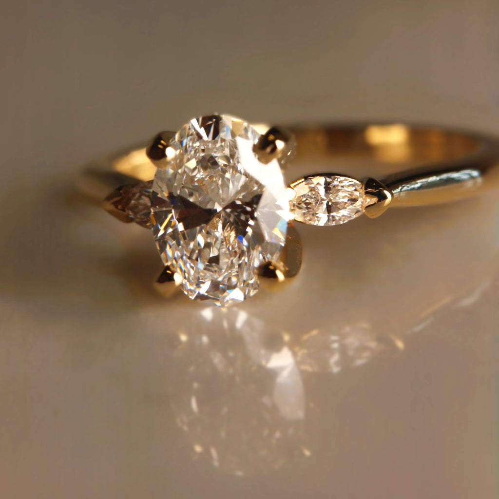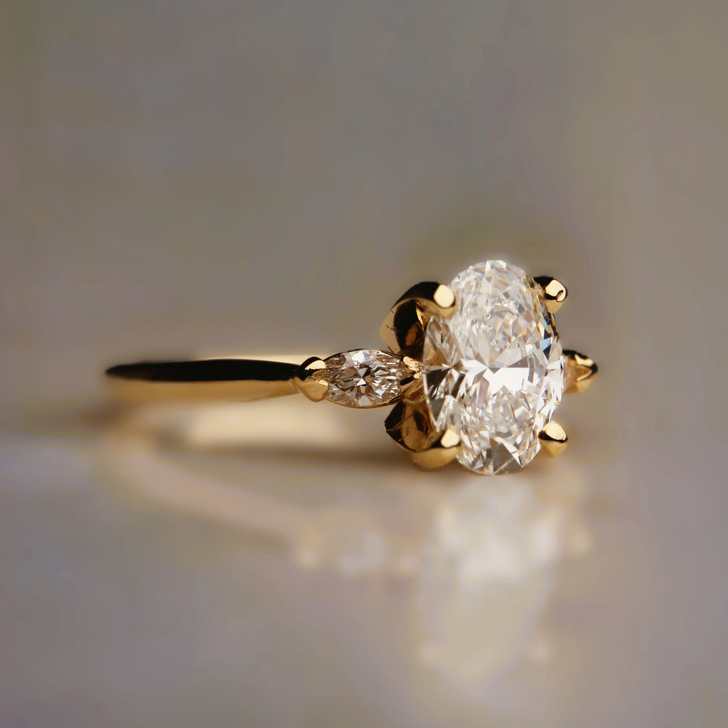 Diamond Details: 1.00 ct lab-grown oval center diamond, VVS1 E and with two 0.05 ct marquise accent diamonds (total 0.10 ct), VS F
