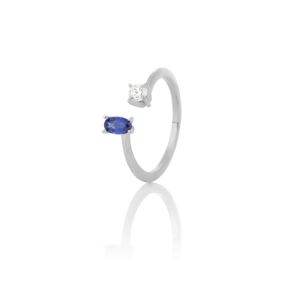 Material: 14K white gold. 0.15 ct. lab grown diamond. Oval shape lab grown sapphire 5x3 mm