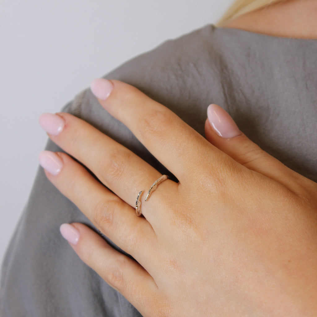 Model is wearing the ring in silver.