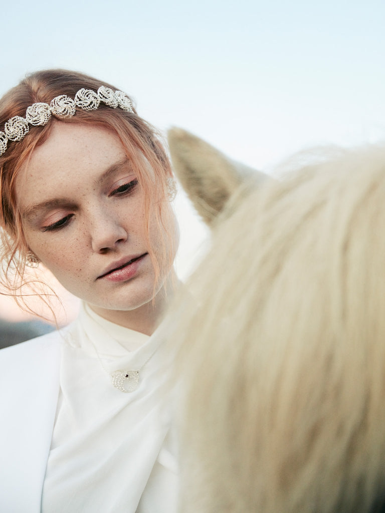 Aurum’s pretty hairpins too can be entwined in your bridal hair for a subtle elegance, and to help uplift your chosen style. The Isold hairpin embodies soft lines and circular shapes, creating dense, multifaceted layers that weave together. Beautifully crafted from recycled sterling silver, and with freshwater pearls, the Isold hairpin can be paired with matching earrings or necklace for a complete bridal look.